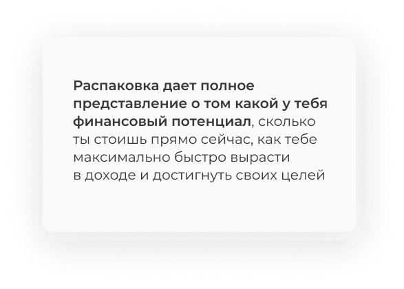Распаковка дает полное представление о том какой у тебя финансовый потенциал, сколько ты стоишь прямо сейчас, как тебе максимально быстро вырасти в доходе и достигнуть своих целей